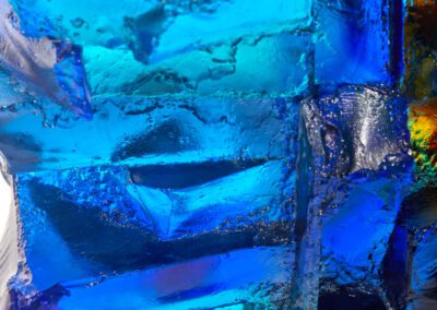 This art glass sculpture is inspired by a harbour on a summer’s day. An array of blues suggests sparkling water under blue skies, the reds and ambers reflect brightly painted boat hulls. The composition of horizontals and verticals suggest the movement of water and boats.