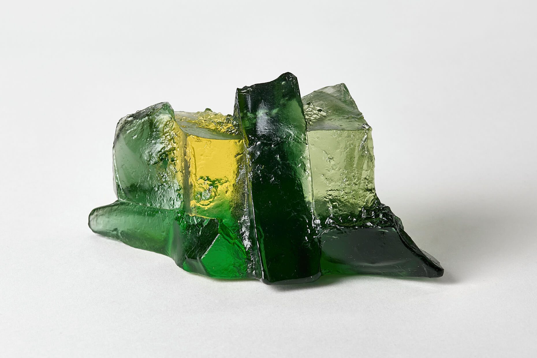 This art glass sculpture is inspired by a rocky outcrop on a hillside setting which is catching the rays of the sun. It has 3 shades of green, yellow suggesting the sun and is lightly textured.