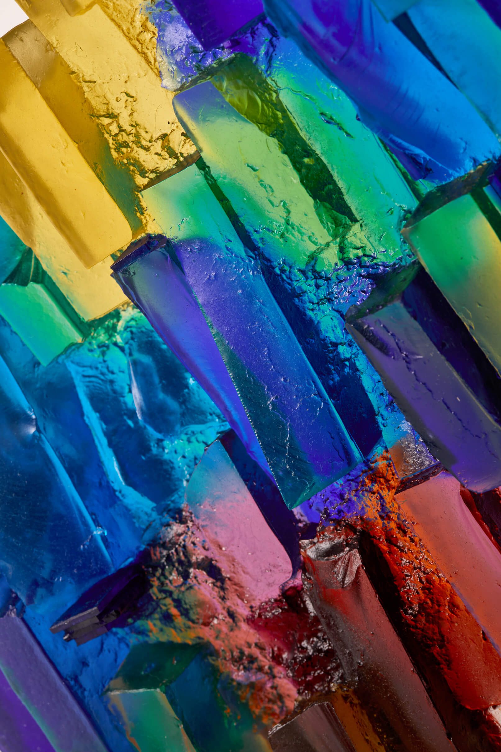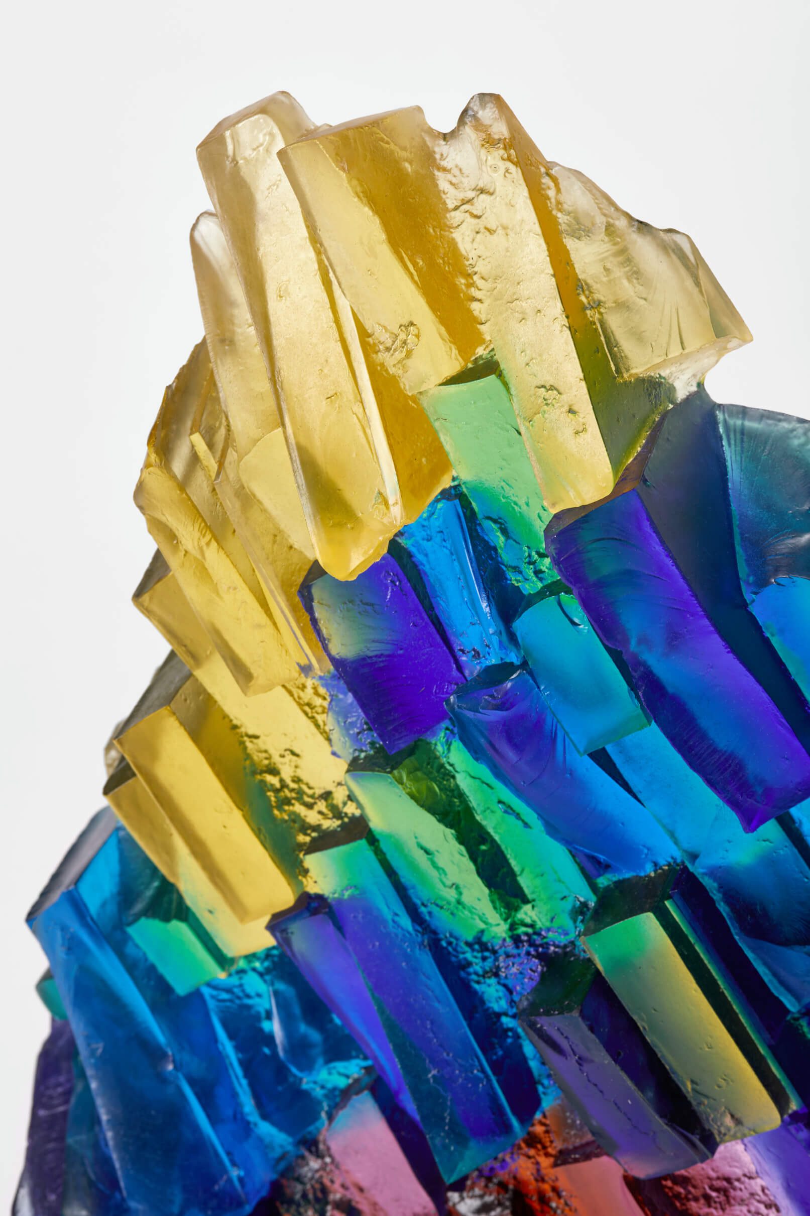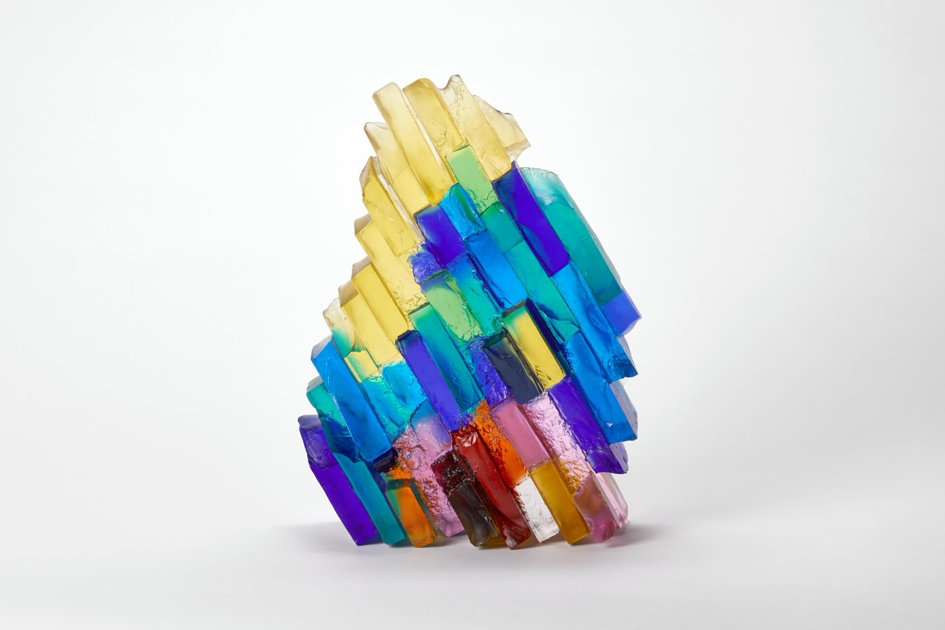 This art glass sculpture is inspired by shafts of sunlight through water lighting up the rocks which always show more of their colours when they’re wet. The blues reflect the deep colours of the sky and the diagonal composition suggests the movement of water.